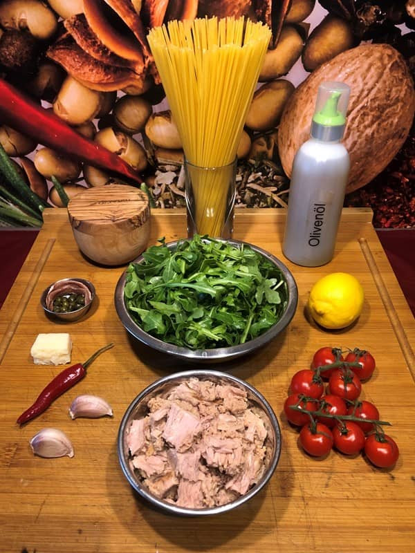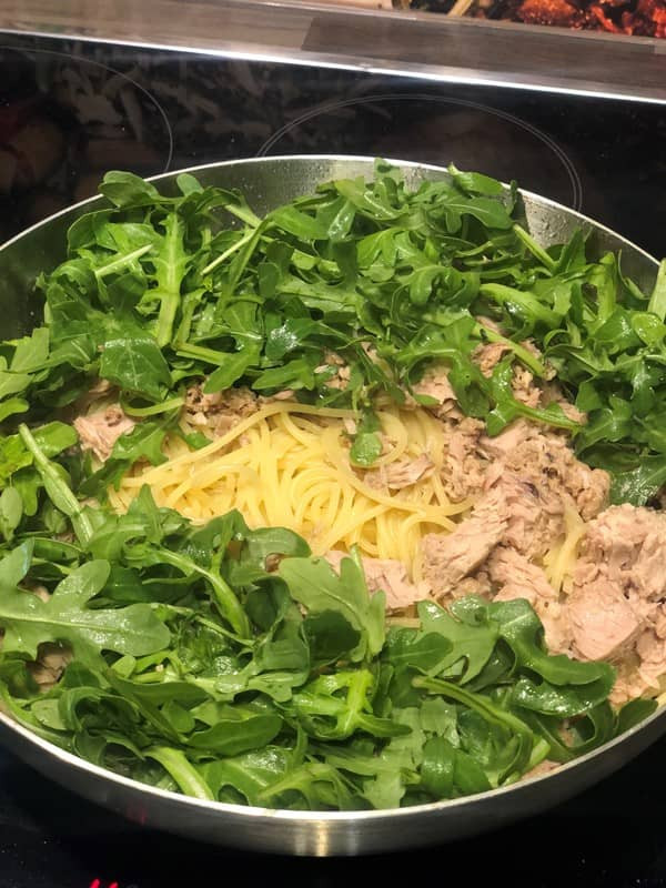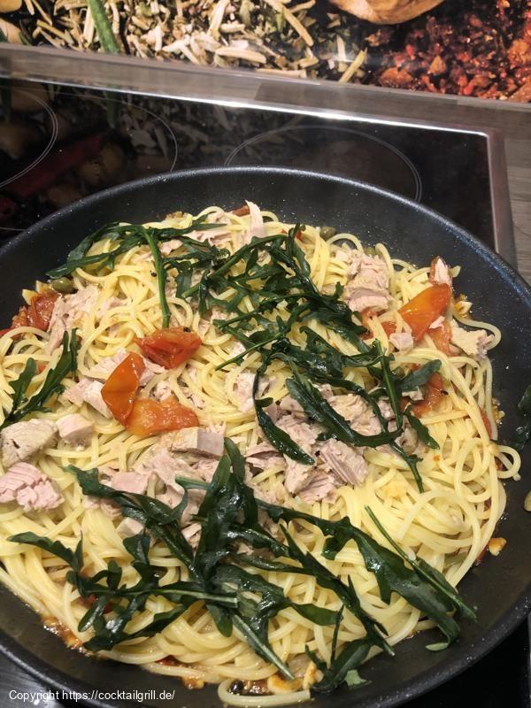 - Thunfisch, Rucola und Saft einer halben Zitrone dazu geben