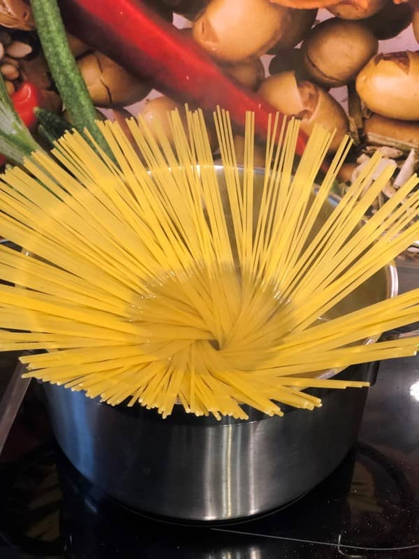 - Wasser aufkochen, salzen und Spaghetti hinein