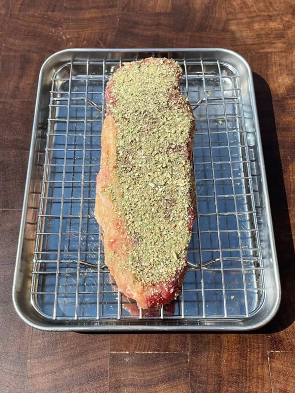 - Fleisch mit Salz und gemörsertem Pfeffer würzen